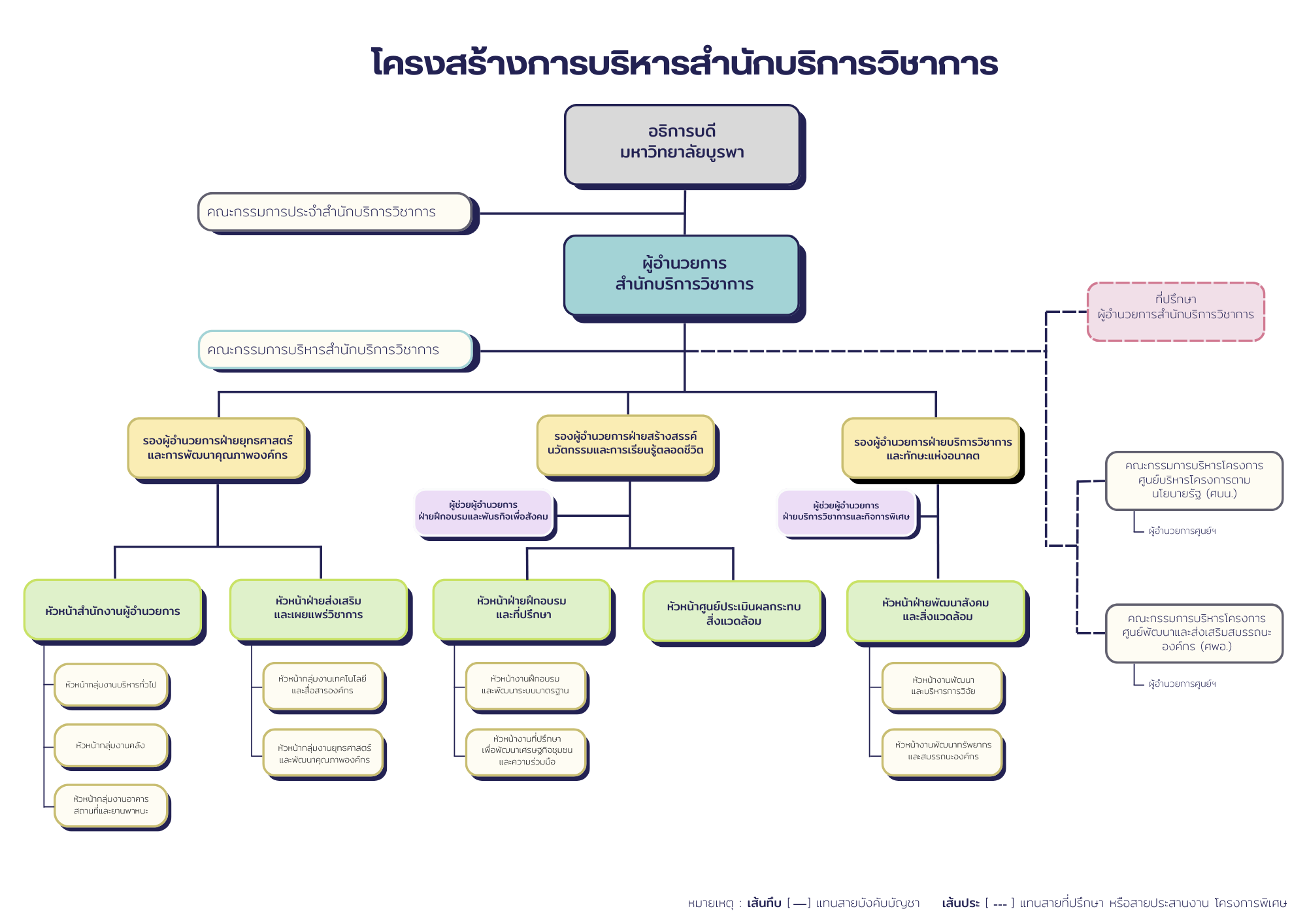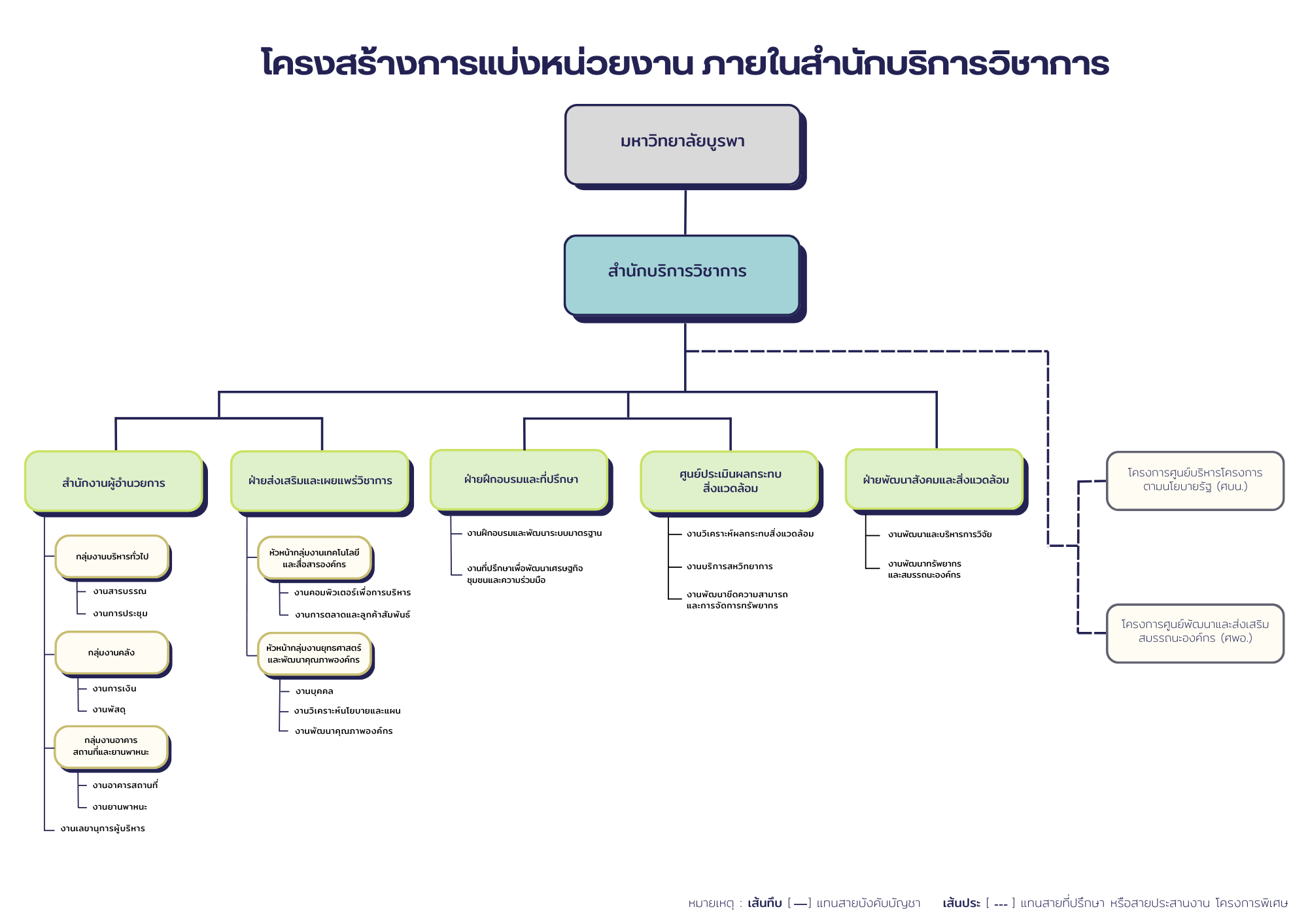 สำนักบริการวิชาการ มหาวิทยาลัยบูรพา แบ่งการบริหารงานออกเป็น 1 สำนักงาน 3 ฝ่าย 1 ศูนย์ และ 2 โครงการศูนย์ ตามภาระหน้าที่ดังนี้คือ สำนักงานผู้อำนวยการ ฝ่ายฝึกอบรมและที่ปรึกษา ฝ่ายส่งเสริมและเผยแพร่วิชาการ ฝ่ายพัฒนาสังคมและสิ่งแวดล้อม ศูนย์ประเมินผลกระทบสิ่งแวดล้อม โครงการศูนย์บริหารโครงการตามนโยบายรัฐ และโครงการศูนย์พัฒนาและส่งเสริมสมรรถนะองค์กร ซึ่งเป็นโครงสร้างองค์กรโดยรวมดังแผนผังโครงสร้าง