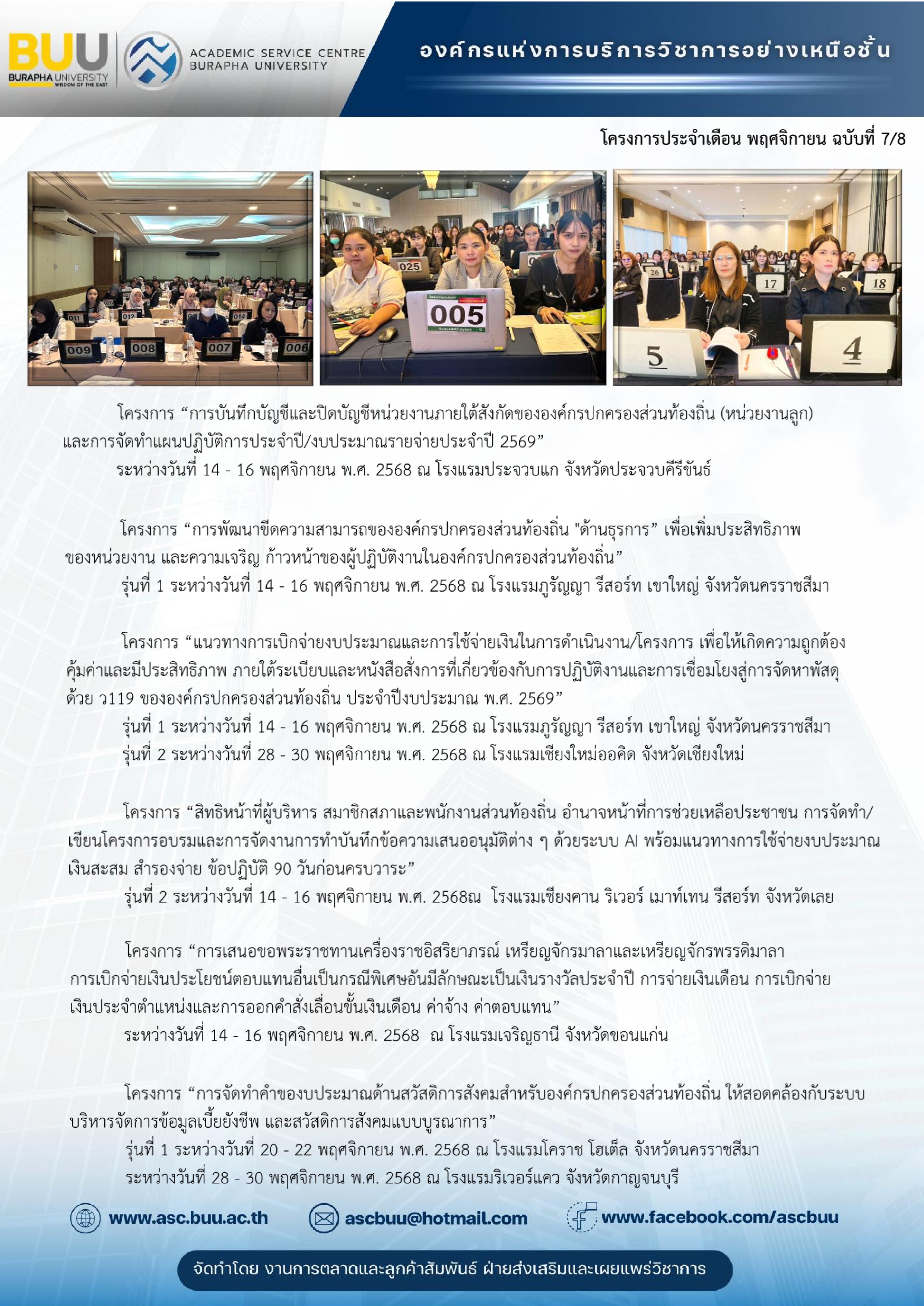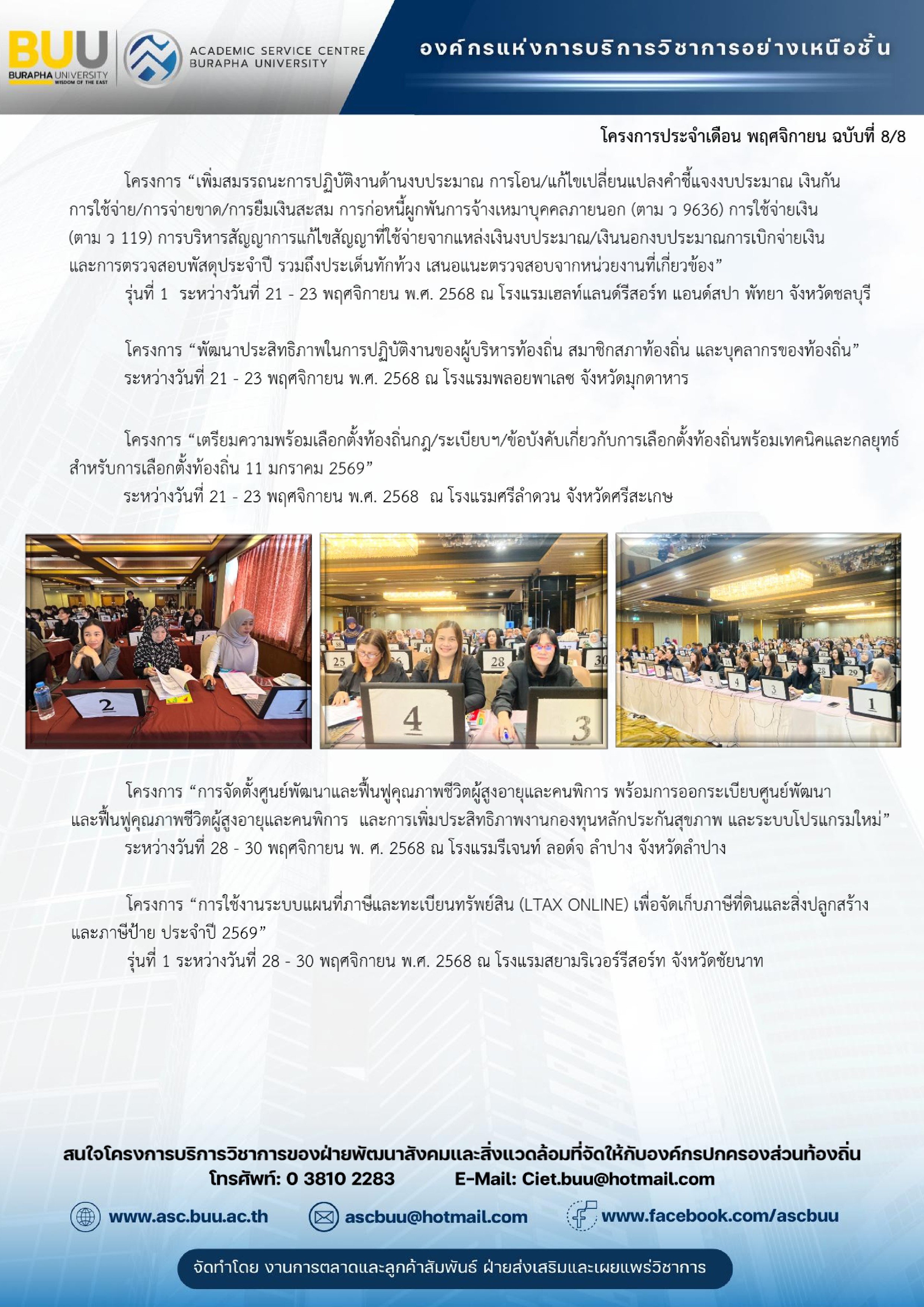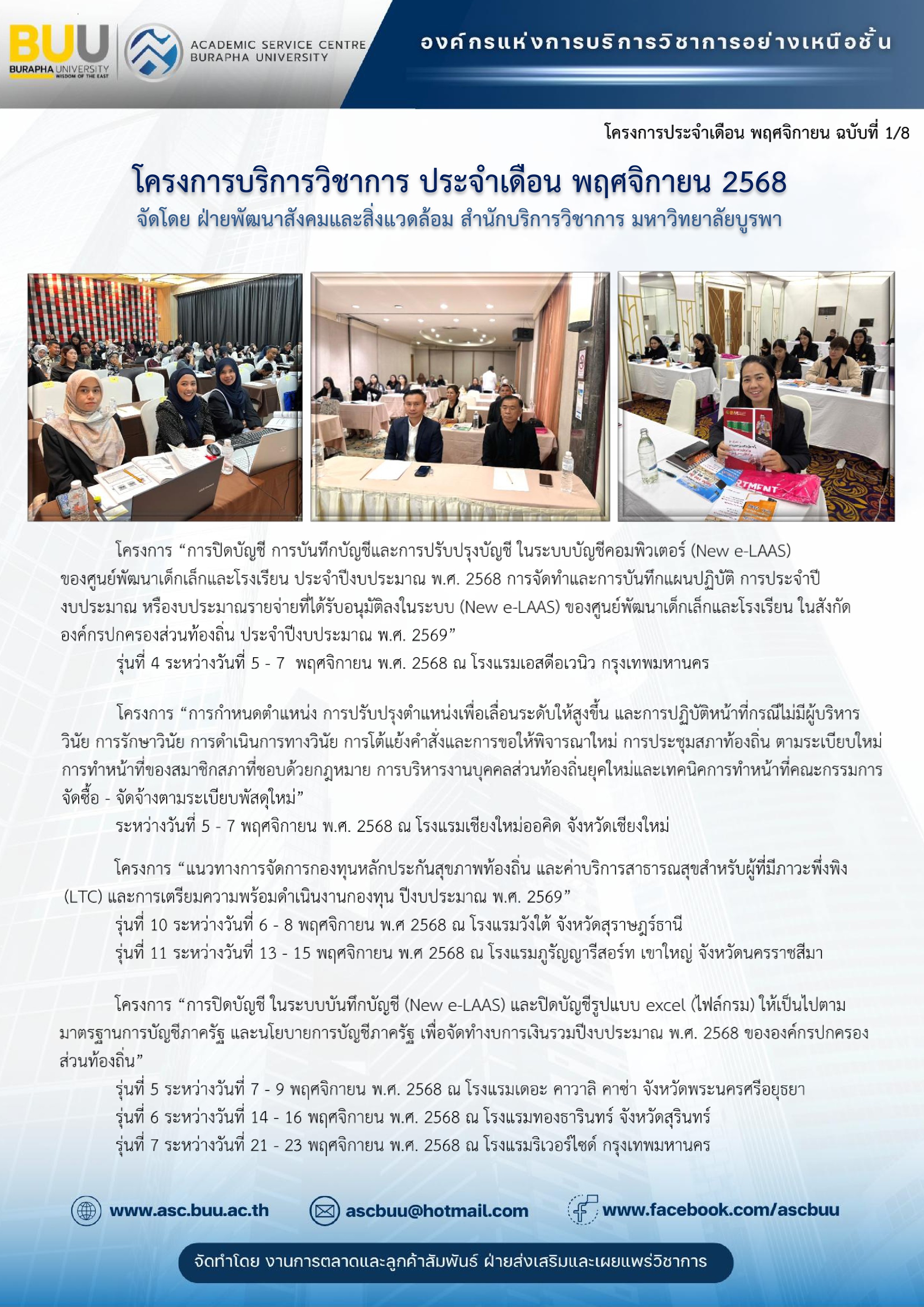 โครงการบริการวิชาการ ประจำเดือน พฤศจิกายน 2568 จัดโดย ฝ่ายพัฒนาสังคมและสิ่งแวดล้อม สำนักบริการวิชาการ มหาวิทยาลัยบูรพา