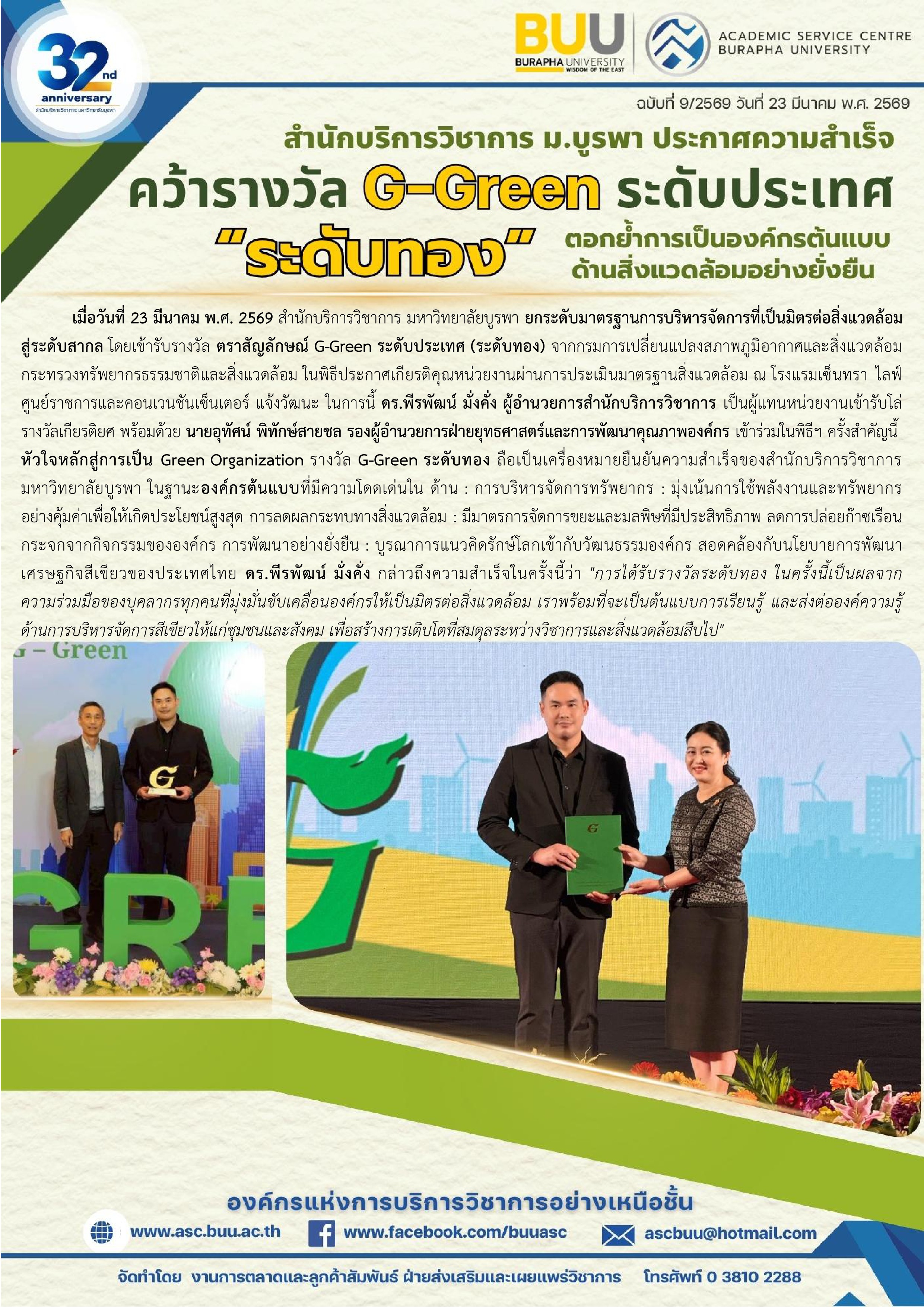 สำนักบริการวิชาการ ม.บูรพา ประกาศความสำเร็จ คว้ารางวัล G-Green ระดับประเทศ ระดับทอง ตอกย้ำการเป็นองค์กรต้นแบบด้านสิ่งแวดล้อมอย่างยั่งยืน