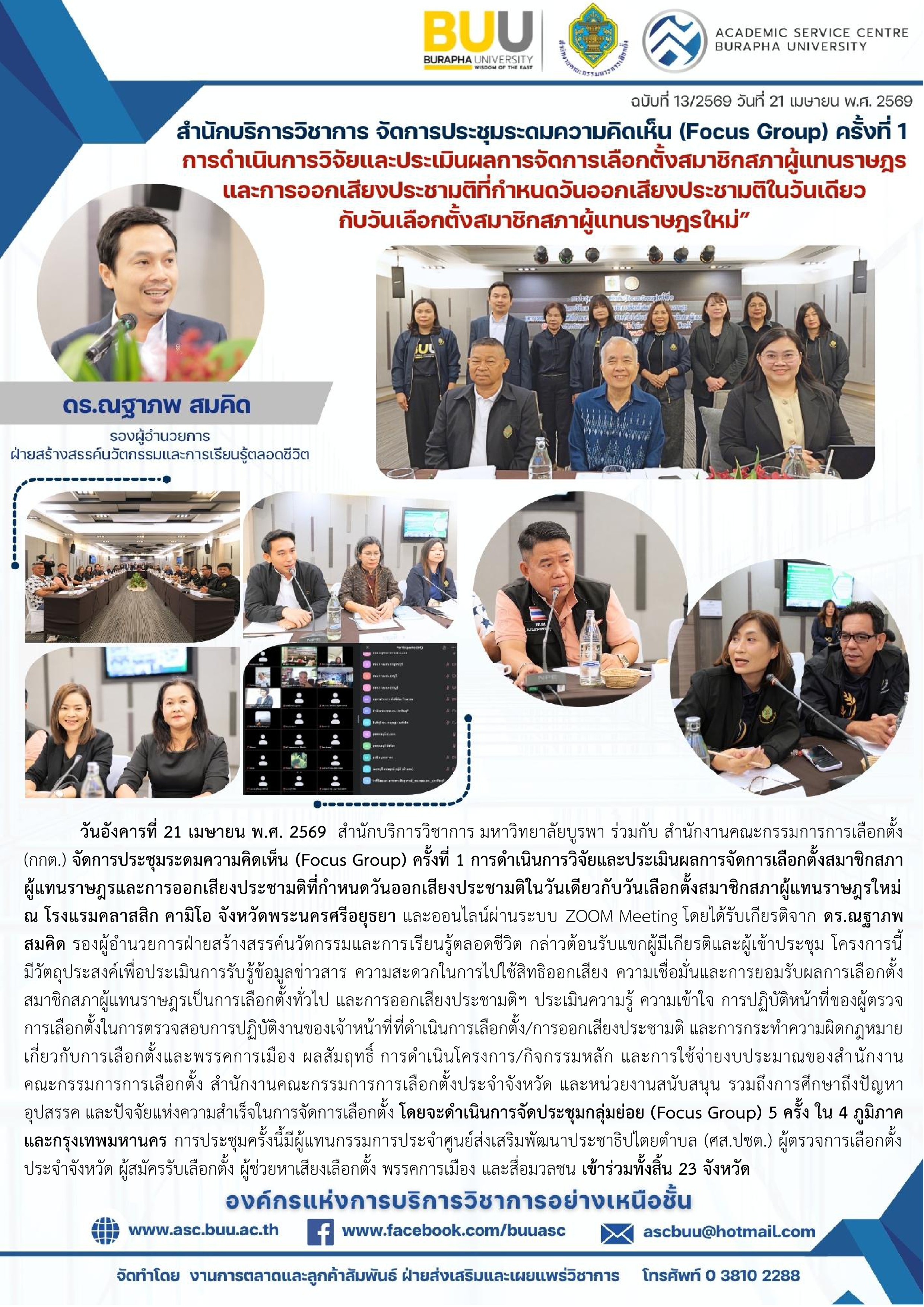สำนักบริการวิชาการ มหาวิทยาลัยบูรพา ร่วมกับ สำนักงานคณะกรรมการการเลือกตั้ง (กกต.) จัดการประชุมระดมความคิดเห็น (Focus Group) ครั้งที่ 1 การดำเนินการวิจัยและประเมินผลการจัดการเลือกตั้งสมาชิกสภา ผู้แทนราษฎรและการออกเสียงประชามติที่กำหนดวันออกเสียงประชามติในวันเดียวกับวันเลือกตั้งสมาชิกสภาผู้แทนราษฎรให